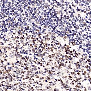IHC检测BRG1蛋白(货号 GB11258). 样品: 人扁桃体, 4%多聚甲醛 (货号G1101) 固定12-24小时. 抗原修复: 柠檬酸抗原修复液(干粉, pH 6.0) (G1201), 98℃, 20分钟. —抗: 1: 200稀释, 4℃ 孵育过夜. 二抗: HRP标记山羊抗兔IgG (H+L) (货号GB23303), 1: 200稀释, 室温孵育1小时. |