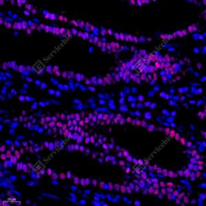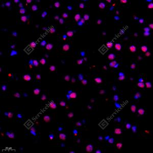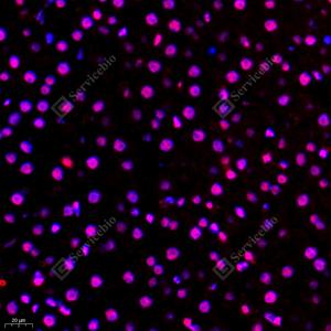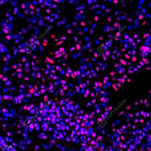 IF检测BRG1蛋白(货号 GB11258)(红色). 样品: 小鼠肾炎, 4%多聚甲醛 (货号G1101) 固定12-24小时. 抗原修复: Tris-EDTA抗原修复液(pH 9.0) (G1203), 98℃, 20分钟. 封闭: 3% BSA(货号GC305010)的PBS溶液, 室温孵育30分钟. —抗: 1: 400稀释, 4℃ 孵育过夜. 二抗: Cy3标记山羊抗兔IgG (H+L) (货号GB21303), 1: 300稀释, 室温孵育1小时. |