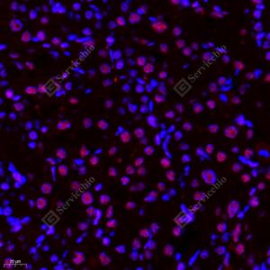 IF检测BRG1蛋白(货号 GB11258)(红色). 样品: 小鼠脑, 4%多聚甲醛 (货号G1101) 固定12-24小时. 抗原修复: Tris-EDTA抗原修复液(pH 9.0) (G1203), 98℃, 20分钟. 封闭: 3% BSA(货号GC305010)的PBS溶液, 室温孵育30分钟. —抗: 1: 400稀释, 4℃ 孵育过夜. 二抗: Cy3标记山羊抗兔IgG (H+L) (货号GB21303), 1: 300稀释, 室温孵育1小时. |