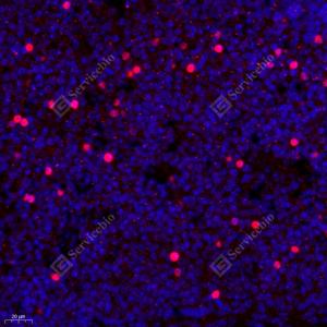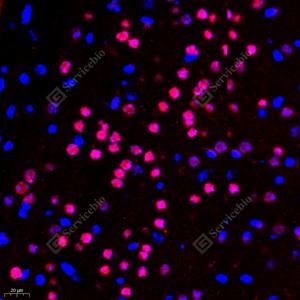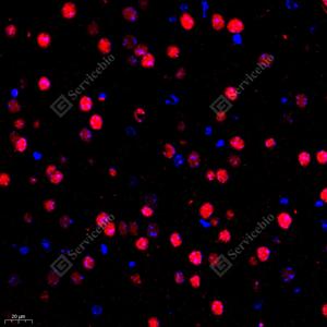 IF检测TBR1蛋白(货号 GB11785)(红色). 样品: 小鼠脑, 4%多聚甲醛 (货号G1101) 固定12-24小时. 抗原修复: Tris-EDTA抗原修复液(pH 9.0) (G1203), 98℃, 20分钟. 封闭: 3% BSA(货号GC305010)的PBS溶液, 室温孵育30分钟. —抗: 1: 500稀释, 4℃ 孵育过夜. 二抗: Cy3标记山羊抗兔IgG (H+L) (货号GB21303), 1: 300稀释, 室温孵育1小时. |