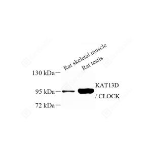 WB检测KAT13D/CLOCK蛋白(货号 GB111884). 样品: 经RIPA裂解液(货号G2002)处理的蛋白质. 封闭: 封闭: 3%脱脂牛奶(货号GC310001)溶于TBST溶液, 室温孵育1小时. —抗: 1: 1000稀释, 4℃ 孵育过夜. 二抗: HRP标记山羊抗兔IgG (H+L) (货号GB23303), 1: 5000稀释, 室温孵育1小时. |