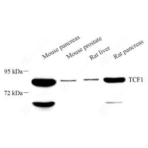 WB检测HNF1 alpha蛋白(货号 GB112214). 样品: 经RIPA裂解液(货号G2002)处理的蛋白质. 封闭: 封闭: 3%脱脂牛奶(货号GC310001)溶于TBST溶液, 室温孵育1小时. —抗: 1: 500稀释, 4℃ 孵育过夜. 二抗: HRP标记山羊抗兔IgG (H+L) (货号GB23303), 1: 5000稀释, 室温孵育1小时. |