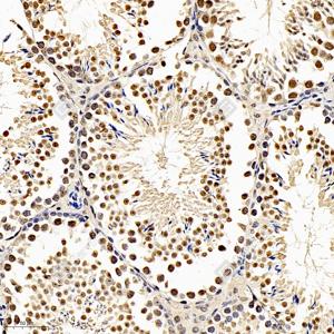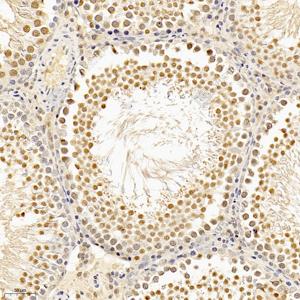 IHC检测KAP1蛋白(货号 GB112038). 样品: 小鼠睾丸, 4%多聚甲醛 (货号G1101) 固定12-24小时. 抗原修复: 柠檬酸抗原修复液(干粉, pH 6.0) (G1201), 98℃, 20分钟. —抗: 1: 1200稀释, 4℃ 孵育过夜. 二抗: HRP标记山羊抗兔IgG (H+L) (货号GB23303), 1: 200稀释, 室温孵育1小时. |