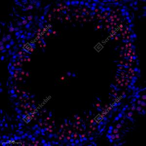 IF检测KAP1蛋白(货号 GB112038)(红色). 样品: 大鼠睾丸, 4%多聚甲醛 (货号G1101) 固定12-24小时. 抗原修复: Tris-EDTA抗原修复液(pH 9.0) (G1203), 98℃, 20分钟. 封闭: 3% BSA(货号GC305010)的PBS溶液, 室温孵育30分钟. —抗: 1: 650稀释, 4℃ 孵育过夜. 二抗: Cy3标记山羊抗兔IgG (H+L) (货号GB21303), 1: 300稀释, 室温孵育1小时. |