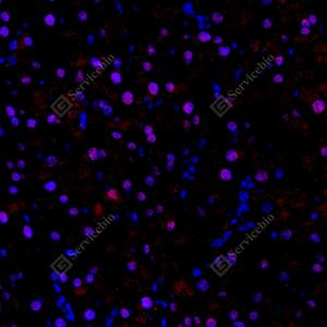 IF检测MIST-1蛋白(货号 GB114483)(红色). 样品: 小鼠胰腺, 4%多聚甲醛 (货号G1101) 固定12-24小时. 抗原修复: Tris-EDTA抗原修复液(pH 9.0) (G1203), 98℃, 20分钟. 封闭: 3% BSA(货号GC305010)的PBS溶液, 室温孵育30分钟. —抗: 1: 1000稀释, 4℃ 孵育过夜. 二抗: Cy3标记山羊抗兔IgG (H+L) (货号GB21303), 1: 300稀释, 室温孵育1小时. |