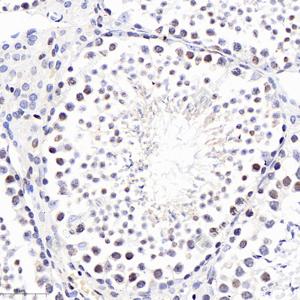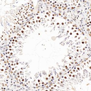 IHC检测TDP43蛋白(货号 GB112160). 样品: 小鼠睾丸, 4%多聚甲醛 (货号G1101) 固定12-24小时. 抗原修复: Tris-EDTA抗原修复液(pH 9.0) (G1203), 98℃, 20分钟. —抗: 1: 200稀释, 4℃ 孵育过夜. 二抗: HRP标记山羊抗兔IgG (H+L) (货号GB23303), 1: 200稀释, 室温孵育1小时. |