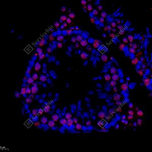 IF检测TDP43蛋白(货号 GB112160)(红色). 样品: 小鼠睾丸, 4%多聚甲醛 (货号G1101) 固定12-24小时. 抗原修复: Tris-EDTA抗原修复液(pH 9.0) (G1203), 98℃, 20分钟. 封闭: 3% BSA(货号GC305010)的PBS溶液, 室温孵育30分钟. —抗: 1: 200稀释, 4℃ 孵育过夜. 二抗: Cy3标记山羊抗兔IgG (H+L) (货号GB21303), 1: 300稀释, 室温孵育1小时. |