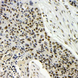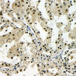 | IHC检测TDP43蛋白(货号 GB115547). 样品: 人肺癌, 4%多聚甲醛 (货号G1101) 固定12-24小时. 抗原修复: Tris-EDTA抗原修复液(pH 9.0) (G1203), 98℃, 20分钟. —抗: 1: 100稀释, 4℃ 孵育过夜. 二抗: HRP标记山羊抗兔IgG (H+L) (货号GB23303), 1: 200稀释, 室温孵育1小时. |