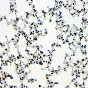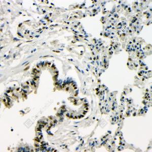 | IHC检测TDP43蛋白(货号 GB115547). 样品: 小鼠肺, 4%多聚甲醛 (货号G1101) 固定12-24小时. 抗原修复: Tris-EDTA抗原修复液(pH 9.0) (G1203), 98℃, 20分钟. —抗: 1: 100稀释, 4℃ 孵育过夜. 二抗: HRP标记山羊抗兔IgG (H+L) (货号GB23303), 1: 200稀释, 室温孵育1小时. |