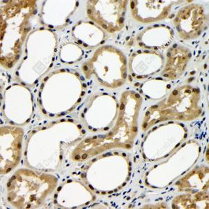 | IHC检测TDP43蛋白(货号 GB115547). 样品: 大鼠肾, 4%多聚甲醛 (货号G1101) 固定12-24小时. 抗原修复: Tris-EDTA抗原修复液(pH 9.0) (G1203), 98℃, 20分钟. —抗: 1: 100稀释, 4℃ 孵育过夜. 二抗: HRP标记山羊抗兔IgG (H+L) (货号GB23303), 1: 200稀释, 室温孵育1小时. |