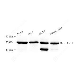 RUVBL1 is a member of the AAA (ATPase associated with diverse cellular activities) family of proteins that is associated with several chromatin-remodelling complexes and has important roles in transcriptional regulation, the DNA damage response, telomerase activity, snoRNP assembly, cellular transformation and cancer metastasis[PMID: 21617703]. It consists of 456 amino acids (50 kDa) and interacts with TATA-binding protein (TBP), which is a central component for transcriptional regulation by forming complexes with various transcription regulators.