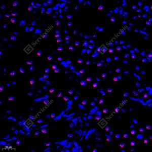 IF检测TIP49A蛋白(货号 GB111869)(红色). 样品: 大鼠肾, 4%多聚甲醛 (货号G1101) 固定12-24小时. 抗原修复: Tris-EDTA抗原修复液(pH 9.0) (G1203), 98℃, 20分钟. 封闭: 3% BSA(货号GC305010)的PBS溶液, 室温孵育30分钟. —抗: 1: 300稀释, 4℃ 孵育过夜. 二抗: Cy3标记山羊抗兔IgG (H+L) (货号GB21303), 1: 300稀释, 室温孵育1小时. |