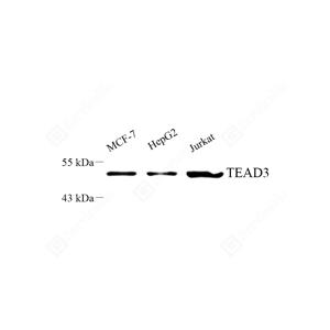 TEAD3, others named ranscriptional enhancer factor 5(TEF5), a member of family of transcription factors that plays a key role in the Hippo signaling pathway, suggesting involve in organ and tumor suppression by restricting proliferation and promoting. TEAD3 contains the TEA/ATTS DNA-binding domain. Human TEAD3 has a strong mRNA expression in placenta and choriocarcinoma cells(JEG-3), but low in Hela, HepG2 and MCF-7. This is a rabbit polyclonal anti-TEAD3 antibody raised against part of C-terminal chain of human TEAD3.