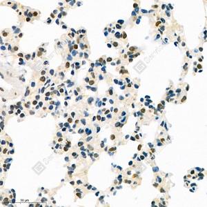 IHC检测TEAD3蛋白(货号 GB111974). 样品: 小鼠肺, 4%多聚甲醛 (货号G1101) 固定12-24小时. 抗原修复: Tris-EDTA抗原修复液(pH 9.0) (G1203), 98℃, 20分钟. —抗: 1: 700稀释, 4℃ 孵育过夜. 二抗: HRP标记山羊抗兔IgG (H+L) (货号GB23303), 1: 200稀释, 室温孵育1小时. |