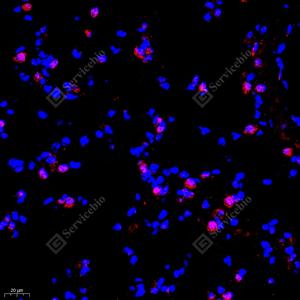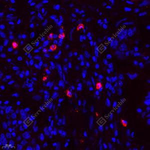 IF检测TEAD3蛋白(货号 GB111974)(红色). 样品: 小鼠肺, 4%多聚甲醛 (货号G1101) 固定12-24小时. 抗原修复: Tris-EDTA抗原修复液(pH 9.0) (G1203), 98℃, 20分钟. 封闭: 3% BSA(货号GC305010)的PBS溶液, 室温孵育30分钟. —抗: 1: 700稀释, 4℃ 孵育过夜. 二抗: Cy3标记山羊抗兔IgG (H+L) (货号GB21303), 1: 300稀释, 室温孵育1小时. |