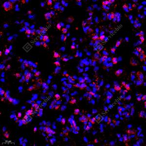 IF检测TEAD3蛋白(货号 GB111974)(红色). 样品: 人肺癌, 4%多聚甲醛 (货号G1101) 固定12-24小时. 抗原修复: Tris-EDTA抗原修复液(pH 9.0) (G1203), 98℃, 20分钟. 封闭: 3% BSA(货号GC305010)的PBS溶液, 室温孵育30分钟. —抗: 1: 700稀释, 4℃ 孵育过夜. 二抗: Cy3标记山羊抗兔IgG (H+L) (货号GB21303), 1: 300稀释, 室温孵育1小时. |