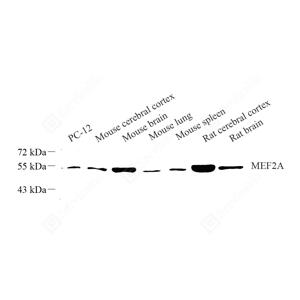 WB检测MEF2A蛋白(货号 GB11965). 样品: 经RIPA裂解液(货号G2002)处理的蛋白质. 封闭: 3%脱脂牛奶(货号GC310001)溶于TBST溶液, 室温孵育1小时. —抗: 1: 500稀释, 4℃ 孵育过夜. 二抗: HRP标记山羊抗兔IgG (H+L) (货号GB23303), 1: 5000稀释, 室温孵育1小时. |
