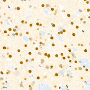 IHC检测MEF2A蛋白(货号 GB11965). 样品: 小鼠脑, 4%多聚甲醛 (货号G1101) 固定12-24小时. 抗原修复: 柠檬酸抗原修复液(干粉, pH 6.0) (G1201), 98℃, 20分钟. —抗: 1: 400稀释, 4℃ 孵育过夜. 二抗: HRP标记山羊抗兔IgG (H+L) (货号GB23303), 1: 200稀释, 室温孵育1小时. |