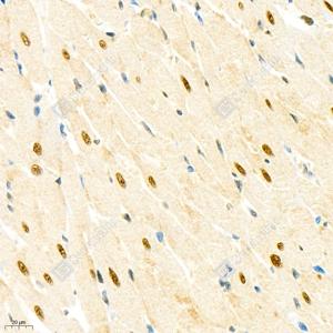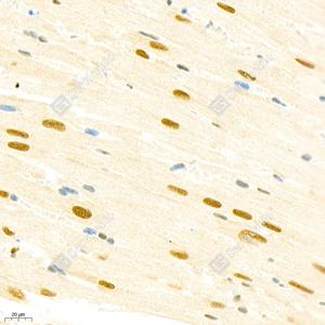 IHC检测MEF2A蛋白(货号 GB11965). 样品: 大鼠心, 4%多聚甲醛 (货号G1101) 固定12-24小时. 抗原修复: 柠檬酸抗原修复液(干粉, pH 6.0) (G1201), 98℃, 20分钟. —抗: 1: 400稀释, 4℃ 孵育过夜. 二抗: HRP标记山羊抗兔IgG (H+L) (货号GB23303), 1: 200稀释, 室温孵育1小时. |