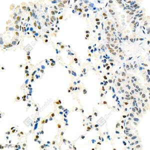 IHC检测MEF2A蛋白(货号 GB11965). 样品: 小鼠肺, 4%多聚甲醛 (货号G1101) 固定12-24小时. 抗原修复: 柠檬酸抗原修复液(干粉, pH 6.0) (G1201), 98℃, 20分钟. —抗: 1: 400稀释, 4℃ 孵育过夜. 二抗: HRP标记山羊抗兔IgG (H+L) (货号GB23303), 1: 200稀释, 室温孵育1小时. |