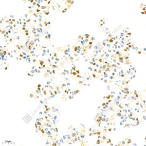 IHC检测MEF2A蛋白(货号 GB11965). 样品: 大鼠肺, 4%多聚甲醛 (货号G1101) 固定12-24小时. 抗原修复: 柠檬酸抗原修复液(干粉, pH 6.0) (G1201), 98℃, 20分钟. —抗: 1: 400稀释, 4℃ 孵育过夜. 二抗: HRP标记山羊抗兔IgG (H+L) (货号GB23303), 1: 200稀释, 室温孵育1小时. |