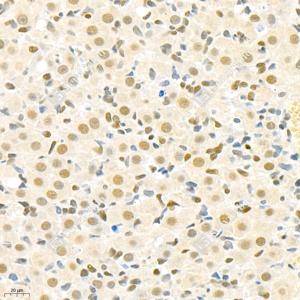 IHC检测MEF2A蛋白(货号 GB11965). 样品: 大鼠卵巢, 4%多聚甲醛 (货号G1101) 固定12-24小时. 抗原修复: 柠檬酸抗原修复液(干粉, pH 6.0) (G1201), 98℃, 20分钟. —抗: 1: 400稀释, 4℃ 孵育过夜. 二抗: HRP标记山羊抗兔IgG (H+L) (货号GB23303), 1: 200稀释, 室温孵育1小时. |