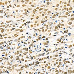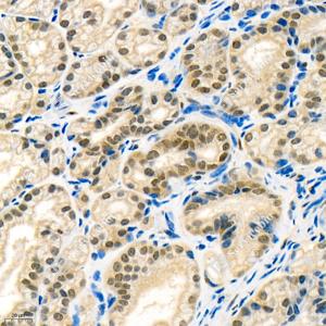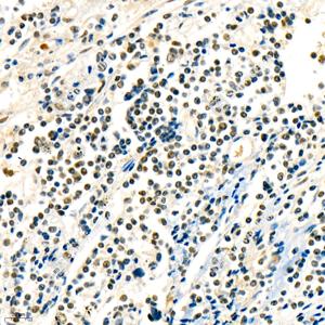 IHC检测Serum Response Factor SRF蛋白(货号 GB111048). 样品: 人胃, 4%多聚甲醛 (货号G1101) 固定12-24小时. 抗原修复: 柠檬酸抗原修复液(干粉, pH 6.0) (G1201), 98℃, 20分钟. —抗: 1: 1500稀释, 4℃ 孵育过夜. 二抗: HRP标记山羊抗兔IgG (H+L) (货号GB23303), 1: 200稀释, 室温孵育1小时. |