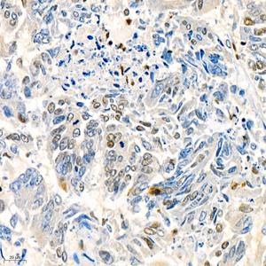 IHC检测Serum Response Factor SRF蛋白(货号 GB111048). 样品: 人肺癌, 4%多聚甲醛 (货号G1101) 固定12-24小时. 抗原修复: 柠檬酸抗原修复液(干粉, pH 6.0) (G1201), 98℃, 20分钟. —抗: 1: 1500稀释, 4℃ 孵育过夜. 二抗: HRP标记山羊抗兔IgG (H+L) (货号GB23303), 1: 200稀释, 室温孵育1小时. |