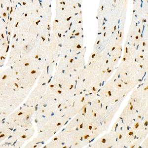 IHC检测Serum Response Factor SRF蛋白(货号 GB111048). 样品: 小鼠心, 4%多聚甲醛 (货号G1101) 固定12-24小时. 抗原修复: 柠檬酸抗原修复液(干粉, pH 6.0) (G1201), 98℃, 20分钟. —抗: 1: 1500稀释, 4℃ 孵育过夜. 二抗: HRP标记山羊抗兔IgG (H+L) (货号GB23303), 1: 200稀释, 室温孵育1小时. |