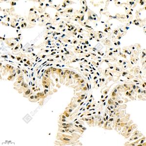 IHC检测Serum Response Factor SRF蛋白(货号 GB111048). 样品: 小鼠肺, 4%多聚甲醛 (货号G1101) 固定12-24小时. 抗原修复: 柠檬酸抗原修复液(干粉, pH 6.0) (G1201), 98℃, 20分钟. —抗: 1: 1500稀释, 4℃ 孵育过夜. 二抗: HRP标记山羊抗兔IgG (H+L) (货号GB23303), 1: 200稀释, 室温孵育1小时. |