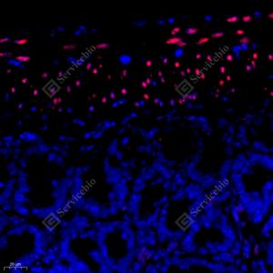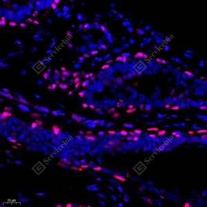 IF检测Serum Response Factor SRF蛋白(货号 GB111048)(红色). 样品: 小鼠小肠, 4%多聚甲醛 (货号G1101) 固定12-24小时. 抗原修复: Tris-EDTA抗原修复液(pH 9.0) (G1203), 98℃, 20分钟. 封闭: 3% BSA(货号GC305010)的PBS溶液, 室温孵育30分钟. —抗: 1: 800稀释, 4℃ 孵育过夜. 二抗: Cy3标记山羊抗兔IgG (H+L) (货号GB21303), 1: 300稀释, 室温孵育1小时. |