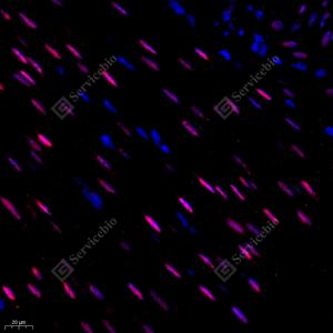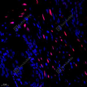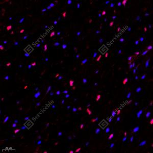 IF检测Serum Response Factor SRF蛋白(货号 GB111048)(红色). 样品: 小鼠心, 4%多聚甲醛 (货号G1101) 固定12-24小时. 抗原修复: Tris-EDTA抗原修复液(pH 9.0) (G1203), 98℃, 20分钟. 封闭: 3% BSA(货号GC305010)的PBS溶液, 室温孵育30分钟. —抗: 1: 800稀释, 4℃ 孵育过夜. 二抗: Cy3标记山羊抗兔IgG (H+L) (货号GB21303), 1: 300稀释, 室温孵育1小时. |