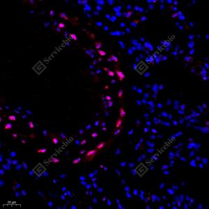 IF检测Serum Response Factor SRF蛋白(货号 GB111048)(红色). 样品: 大鼠肺, 4%多聚甲醛 (货号G1101) 固定12-24小时. 抗原修复: Tris-EDTA抗原修复液(pH 9.0) (G1203), 98℃, 20分钟. 封闭: 3% BSA(货号GC305010)的PBS溶液, 室温孵育30分钟. —抗: 1: 800稀释, 4℃ 孵育过夜. 二抗: Cy3标记山羊抗兔IgG (H+L) (货号GB21303), 1: 300稀释, 室温孵育1小时. |