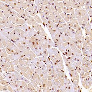 IHC检测RB associated KRAB repressor蛋白(货号 GB112588). 样品: 小鼠心, 4%多聚甲醛 (货号G1101) 固定12-24小时. 抗原修复: Tris-EDTA抗原修复液(pH 9.0) (G1203), 98℃, 20分钟. —抗: 1: 1000稀释, 4℃ 孵育过夜. 二抗: HRP标记山羊抗兔IgG (H+L) (货号GB23303), 1: 200稀释, 室温孵育1小时. |