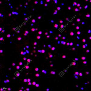 IF检测RB associated KRAB repressor蛋白(货号 GB112588)(红色). 样品: 小鼠脑, 4%多聚甲醛 (货号G1101) 固定12-24小时. 抗原修复: Tris-EDTA抗原修复液(pH 9.0) (G1203), 98℃, 20分钟. 封闭: 3% BSA(货号GC305010)的PBS溶液, 室温孵育30分钟. —抗: 1: 400稀释, 4℃ 孵育过夜. 二抗: Cy3标记山羊抗兔IgG (H+L) (货号GB21303), 1: 300稀释, 室温孵育1小时. |