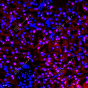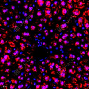 IF检测RB associated KRAB repressor蛋白(货号 GB112588)(红色). 样品: 小鼠肝, 4%多聚甲醛 (货号G1101) 固定12-24小时. 抗原修复: Tris-EDTA抗原修复液(pH 9.0) (G1203), 98℃, 20分钟. 封闭: 3% BSA(货号GC305010)的PBS溶液, 室温孵育30分钟. —抗: 1: 400稀释, 4℃ 孵育过夜. 二抗: Cy3标记山羊抗兔IgG (H+L) (货号GB21303), 1: 300稀释, 室温孵育1小时. |