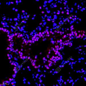 IF检测RB associated KRAB repressor蛋白(货号 GB112588)(红色). 样品: 小鼠肺, 4%多聚甲醛 (货号G1101) 固定12-24小时. 抗原修复: Tris-EDTA抗原修复液(pH 9.0) (G1203), 98℃, 20分钟. 封闭: 3% BSA(货号GC305010)的PBS溶液, 室温孵育30分钟. —抗: 1: 400稀释, 4℃ 孵育过夜. 二抗: Cy3标记山羊抗兔IgG (H+L) (货号GB21303), 1: 300稀释, 室温孵育1小时. |