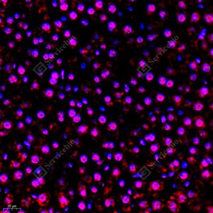 IF检测RB associated KRAB repressor蛋白(货号 GB112588)(红色). 样品: 大鼠肝, 4%多聚甲醛 (货号G1101) 固定12-24小时. 抗原修复: Tris-EDTA抗原修复液(pH 9.0) (G1203), 98℃, 20分钟. 封闭: 3% BSA(货号GC305010)的PBS溶液, 室温孵育30分钟. —抗: 1: 400稀释, 4℃ 孵育过夜. 二抗: Cy3标记山羊抗兔IgG (H+L) (货号GB21303), 1: 300稀释, 室温孵育1小时. |