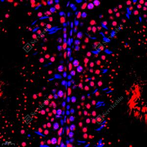 IF检测RB associated KRAB repressor蛋白(货号 GB112588)(红色). 样品: 大鼠睾丸, 4%多聚甲醛 (货号G1101) 固定12-24小时. 抗原修复: Tris-EDTA抗原修复液(pH 9.0) (G1203), 98℃, 20分钟. 封闭: 3% BSA(货号GC305010)的PBS溶液, 室温孵育30分钟. —抗: 1: 400稀释, 4℃ 孵育过夜. 二抗: Cy3标记山羊抗兔IgG (H+L) (货号GB21303), 1: 300稀释, 室温孵育1小时. |