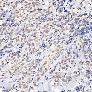 IHC检测RING1蛋白(货号 GB112531). 样品: 人胃癌, 4%多聚甲醛 (货号G1101) 固定12-24小时. 抗原修复: Tris-EDTA抗原修复液(pH 9.0) (G1203), 98℃, 20分钟. —抗: 1: 3600稀释, 4℃ 孵育过夜. 二抗: HRP标记山羊抗兔IgG (H+L) (货号GB23303), 1: 200稀释, 室温孵育1小时. |