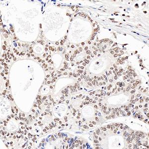 IHC检测RING1蛋白(货号 GB112531). 样品: 人乳腺癌, 4%多聚甲醛 (货号G1101) 固定12-24小时. 抗原修复: Tris-EDTA抗原修复液(pH 9.0) (G1203), 98℃, 20分钟. —抗: 1: 3600稀释, 4℃ 孵育过夜. 二抗: HRP标记山羊抗兔IgG (H+L) (货号GB23303), 1: 200稀释, 室温孵育1小时. |