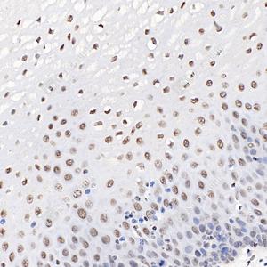 IHC检测RING1蛋白(货号 GB112531). 样品: 人食管, 4%多聚甲醛 (货号G1101) 固定12-24小时. 抗原修复: Tris-EDTA抗原修复液(pH 9.0) (G1203), 98℃, 20分钟. —抗: 1: 3600稀释, 4℃ 孵育过夜. 二抗: HRP标记山羊抗兔IgG (H+L) (货号GB23303), 1: 200稀释, 室温孵育1小时. |