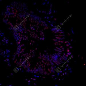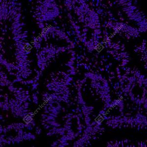 IF检测RING1蛋白(货号 GB112531)(红色). 样品: 人结肠癌, 4%多聚甲醛 (货号G1101) 固定12-24小时. 抗原修复: Tris-EDTA抗原修复液(pH 9.0) (G1203), 98℃, 20分钟. 封闭: 3% BSA(货号GC305010)的PBS溶液, 室温孵育30分钟. —抗: 1: 800稀释, 4℃ 孵育过夜. 二抗: Cy3标记山羊抗兔IgG (H+L) (货号GB21303), 1: 300稀释, 室温孵育1小时. |