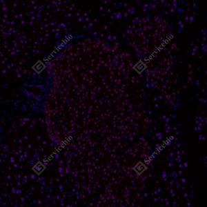 IF检测RING1蛋白(货号 GB112531)(红色). 样品: 小鼠胰腺, 4%多聚甲醛 (货号G1101) 固定12-24小时. 抗原修复: Tris-EDTA抗原修复液(pH 9.0) (G1203), 98℃, 20分钟. 封闭: 3% BSA(货号GC305010)的PBS溶液, 室温孵育30分钟. —抗: 1: 800稀释, 4℃ 孵育过夜. 二抗: Cy3标记山羊抗兔IgG (H+L) (货号GB21303), 1: 300稀释, 室温孵育1小时. |