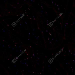 IF检测RING1蛋白(货号 GB112531)(红色). 样品: 大鼠骨骼肌, 4%多聚甲醛 (货号G1101) 固定12-24小时. 抗原修复: Tris-EDTA抗原修复液(pH 9.0) (G1203), 98℃, 20分钟. 封闭: 3% BSA(货号GC305010)的PBS溶液, 室温孵育30分钟. —抗: 1: 800稀释, 4℃ 孵育过夜. 二抗: Cy3标记山羊抗兔IgG (H+L) (货号GB21303), 1: 300稀释, 室温孵育1小时. |