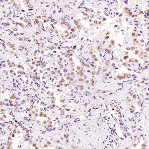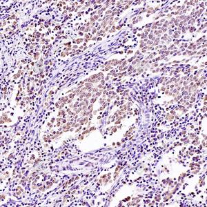 IHC检测SRFBP1蛋白(货号 GB112788). 样品: 人肺癌, 4%多聚甲醛 (货号G1101) 固定12-24小时. 抗原修复: 柠檬酸抗原修复液(干粉, pH 6.0) (G1201), 98℃, 20分钟. —抗: 1: 2000稀释, 4℃ 孵育过夜. 二抗: HRP标记山羊抗兔IgG (H+L) (货号GB23303), 1: 200稀释, 室温孵育1小时. |