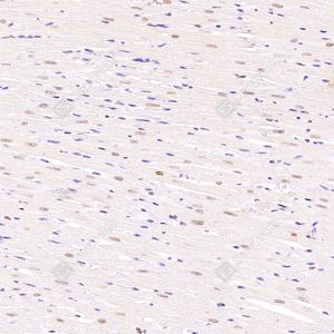 IHC检测SRFBP1蛋白(货号 GB112788). 样品: 小鼠心, 4%多聚甲醛 (货号G1101) 固定12-24小时. 抗原修复: 柠檬酸抗原修复液(干粉, pH 6.0) (G1201), 98℃, 20分钟. —抗: 1: 2000稀释, 4℃ 孵育过夜. 二抗: HRP标记山羊抗兔IgG (H+L) (货号GB23303), 1: 200稀释, 室温孵育1小时. |