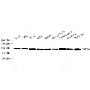 WB检测Hsp90蛋白(货号 GB12284). 样品: 经RIPA裂解液(货号G2002)处理的蛋白质. 封闭: 3%脱脂牛奶(货号GC310001)溶于TBST溶液, 室温孵育1小时. —抗: 1: 1000稀释, 4℃ 孵育过夜. 二抗: HRP标记山羊抗小鼠IgG (H+L) (货号GB23301), 1: 5000稀释, 室温孵育1小时. |