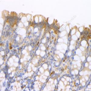 IHC检测Hsp90蛋白(货号 GB12284). 样品: 大鼠结肠, 4%多聚甲醛 (货号G1101) 固定12-24小时. 抗原修复: 柠檬酸抗原修复液(干粉, pH 6.0) (G1201), 高压锅均匀喷气计时2分钟. —抗: 1: 1000稀释, 4℃ 孵育过夜. 二抗: HRP标记山羊抗小鼠IgG (H+L) (货号GB23301), 1: 200稀释, 室温孵育1小时. |