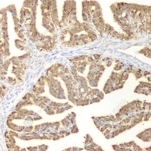 IHC检测Hsp90蛋白(货号 GB12284). 样品: 大鼠卵巢, 4%多聚甲醛 (货号G1101) 固定12-24小时. 抗原修复: 柠檬酸抗原修复液(干粉, pH 6.0) (G1201), 高压锅均匀喷气计时2分钟. —抗: 1: 1000稀释, 4℃ 孵育过夜. 二抗: HRP标记山羊抗小鼠IgG (H+L) (货号GB23301), 1: 200稀释, 室温孵育1小时. |